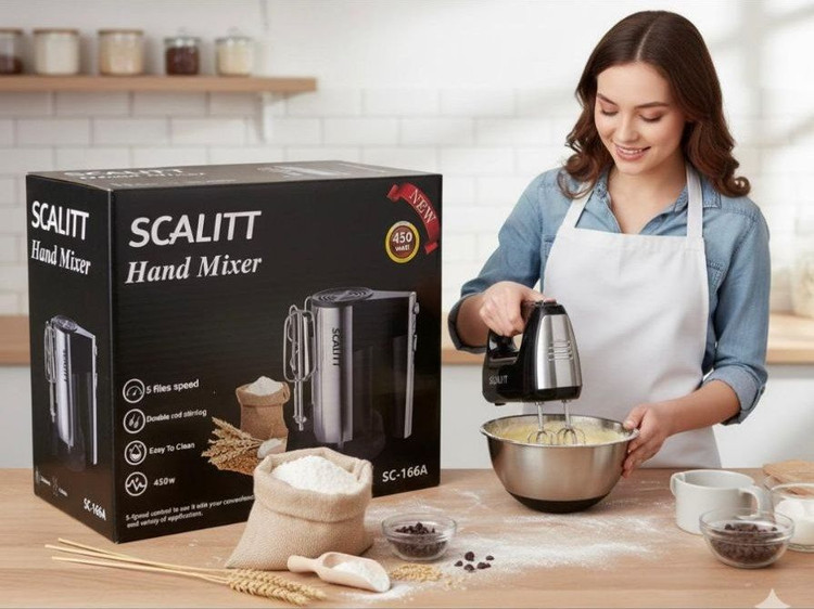 همزن دستی SCALITT مدل SC‑166A یک همزن برقی خانگی خوشساخت و کاربردی است که برای مصارف روزمره آشپزخانه طراحی شده. این مدل با توان 450 وات، 5 سرعت قابل تنظیم و طراحی ارگونومیک، گزینهای مناسب برای تهیه انواع کیک، شیرینی، خامه، تخممرغ و خمیرهای سبک محسوب میشود.
